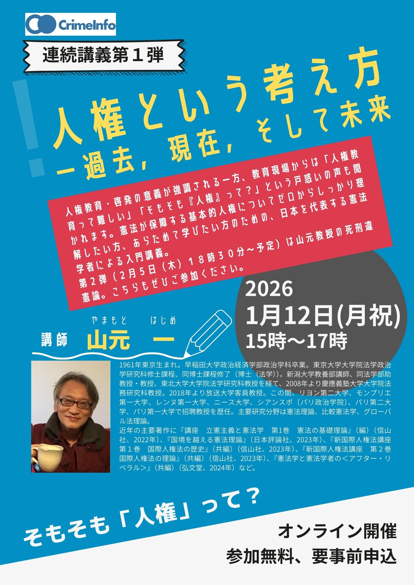 2025年12月11日 2026年1月12日(月・祝)15:00~ 山元一氏(慶應義塾大学大学院法務研究科教授) 連続講座第一弾「人権という考え方ー過去,現在,そして未来」オンライン開催のお知らせ 人権教育・啓発の意義が強調される一方、教育現場からは「人権教育って難しい」「そもそも『人権』って?」という戸惑いの声も聞かれます。憲法が保障する基本的人権についてゼロからしっかり理解したい方、あらためて学びたい方のための、日本を代表する憲法学者による入門講義。 【開催日時】2026年1月12日(月・祝)15:00~17:00 Zoomによるオンライン開催 参加無料 要事前申込 参加お申込みフォーム 第2弾(2月5日(木)18:30〜予定)は山元教授の死刑違憲論。こちらもぜひご参加ください。 参加お申込みフォーム